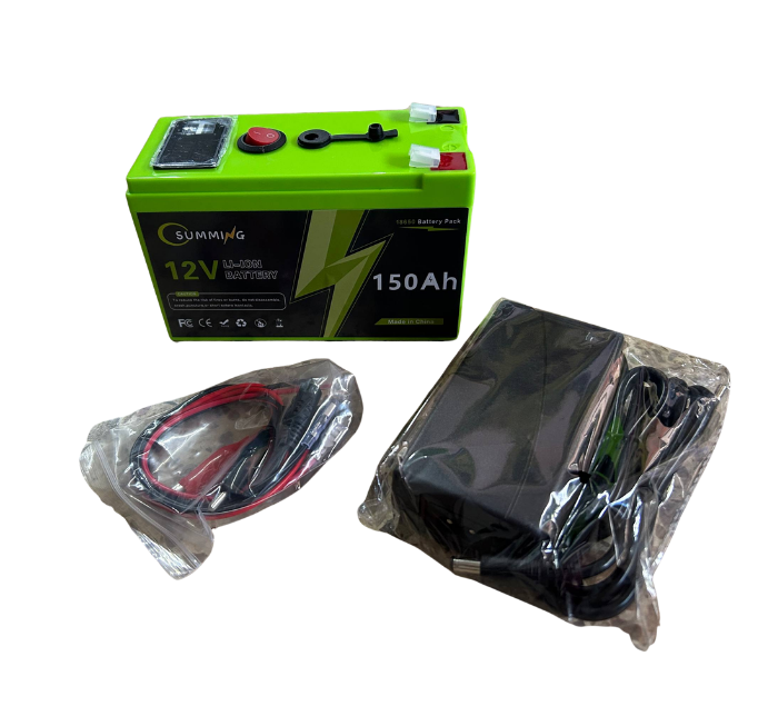 Batería de litio 12V 150Ah. Cuenta con diseño compacto, estructura resistente y conexiones seguras. Incluye cargador y cables para una instalación práctica y sencilla.