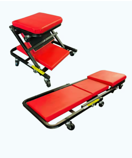 Camilla de mantenimiento 2 en 1 ideal para talleres mecánicos. Puede utilizarse como superficie de descanso para trabajar bajo el coche o transformarse fácilmente en asiento con respaldo. Cuenta con ruedas resistentes y cojines acolchados para mayor comodidad. Compacta, plegable y funcional para profesionales o uso doméstico.