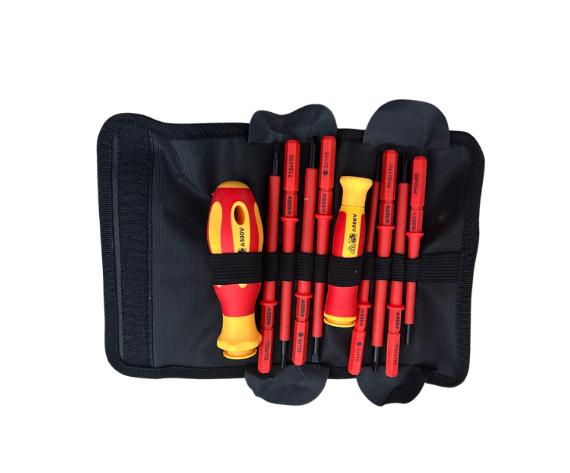 Set de destornilladores para trabajos eléctricos y de precisión. Incluye varias puntas y tamaños para adaptarse a diferentes tornillos, con mangos ergonómicos que ofrecen un control seguro y cómodo durante su uso.