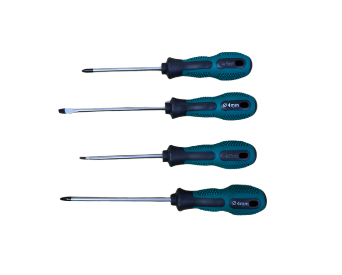 Juego de 4 destornilladores con mangos ergonómicos y aislamiento eléctrico para trabajos seguros en instalaciones eléctricas. Indispensables en el equipo de todo electricista profesional o aficionado.